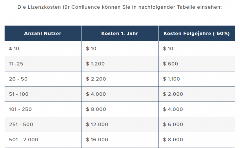Mit Confluence kommen Kunden dabei wesentlich preiswerter weg. Auf Grund gestaffelter Preise nach Nutzerzahl wird Confluence besonders ab dem zweiten Nutzungsjahr ein preiswertes Tool. Bedenkt man, dass eine Integration eines solchen Programms langfristig angelegt ist, kann dies ein durchaus signifikanter Punkt sein.